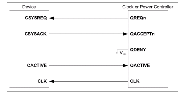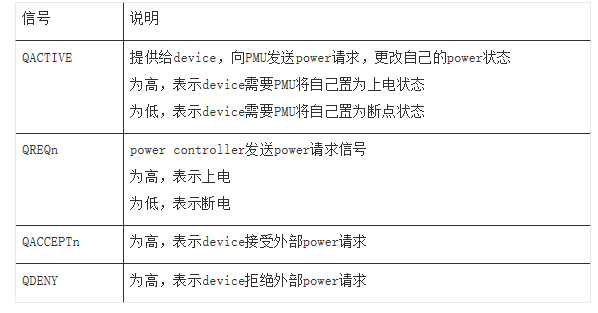 QACTIVE,是提供给device,给PMU发送power请求的信号。可以由多个来源的组合。如果为高,那么PMU要给自己上电,并且之后,不能给自己断电。