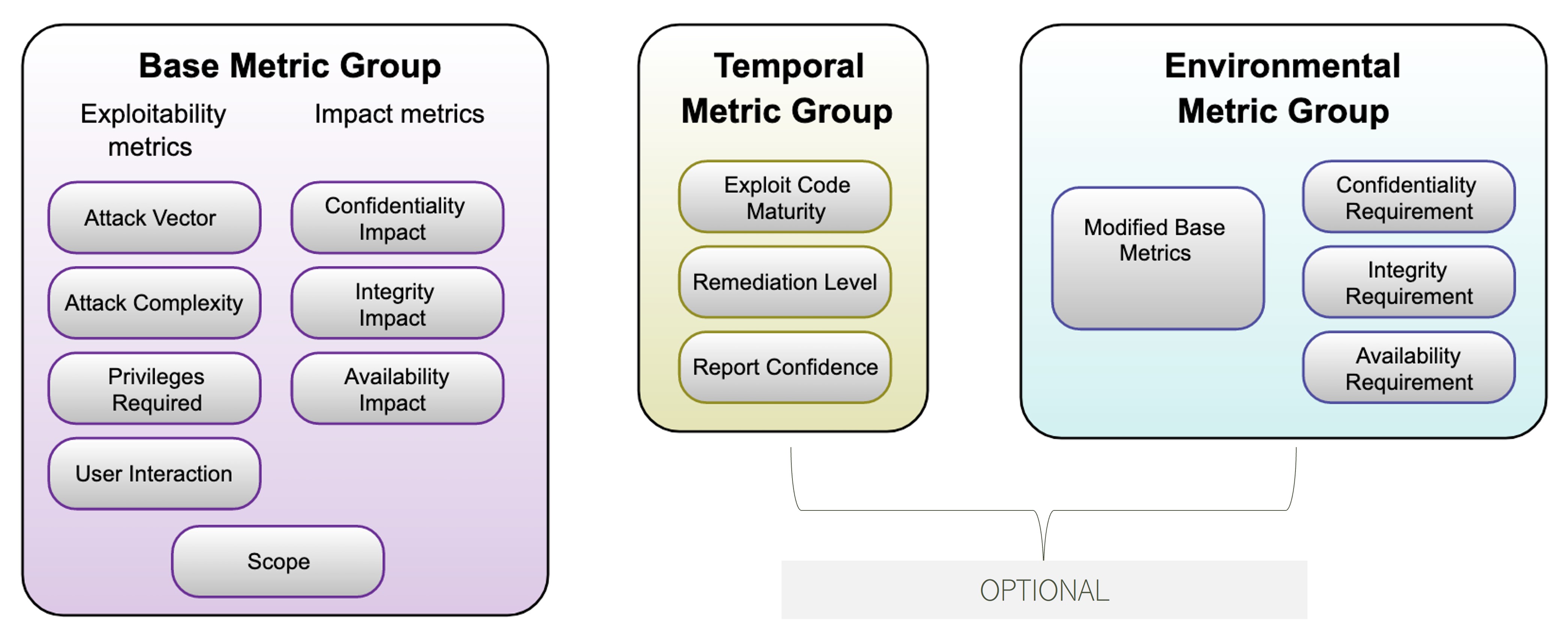 美国国家标准与技术研究院 (NIST) 通过定义通用漏洞评分系统 ([CVSS]) 来对发现的漏洞的严重性进行定量评估,从而进一步有序地执行该过程。如图 1 所示,[CVSS v3.1]规范定义了三个指标组:基本、临时和环境。在本文的讨论范围内,仅需要考虑 Base 组,该组表示漏洞的内在品质,这些特性在一段时间内和跨用户环境中保持不变。[CVSS 计算器]提供漏洞的总体分数。