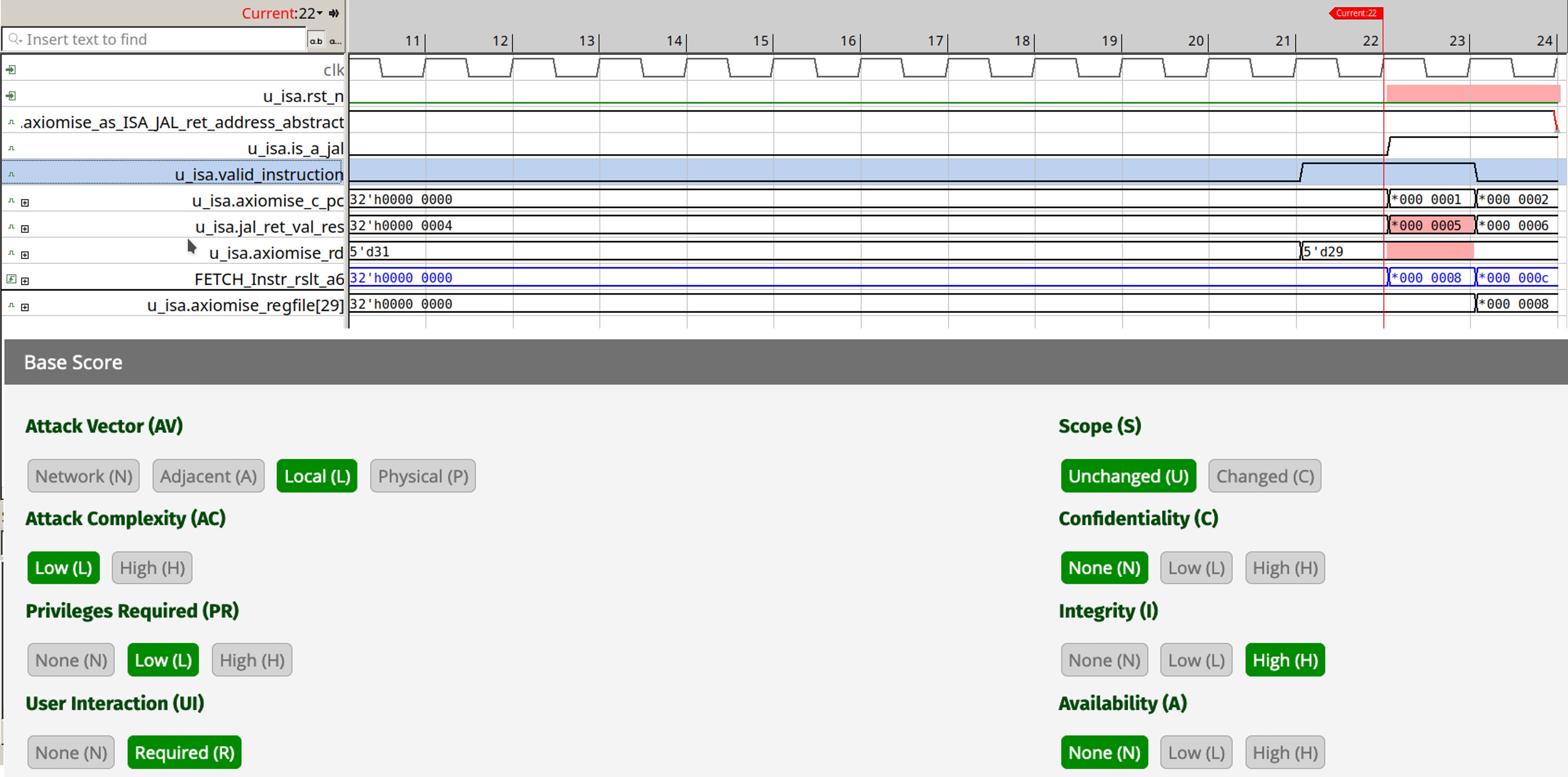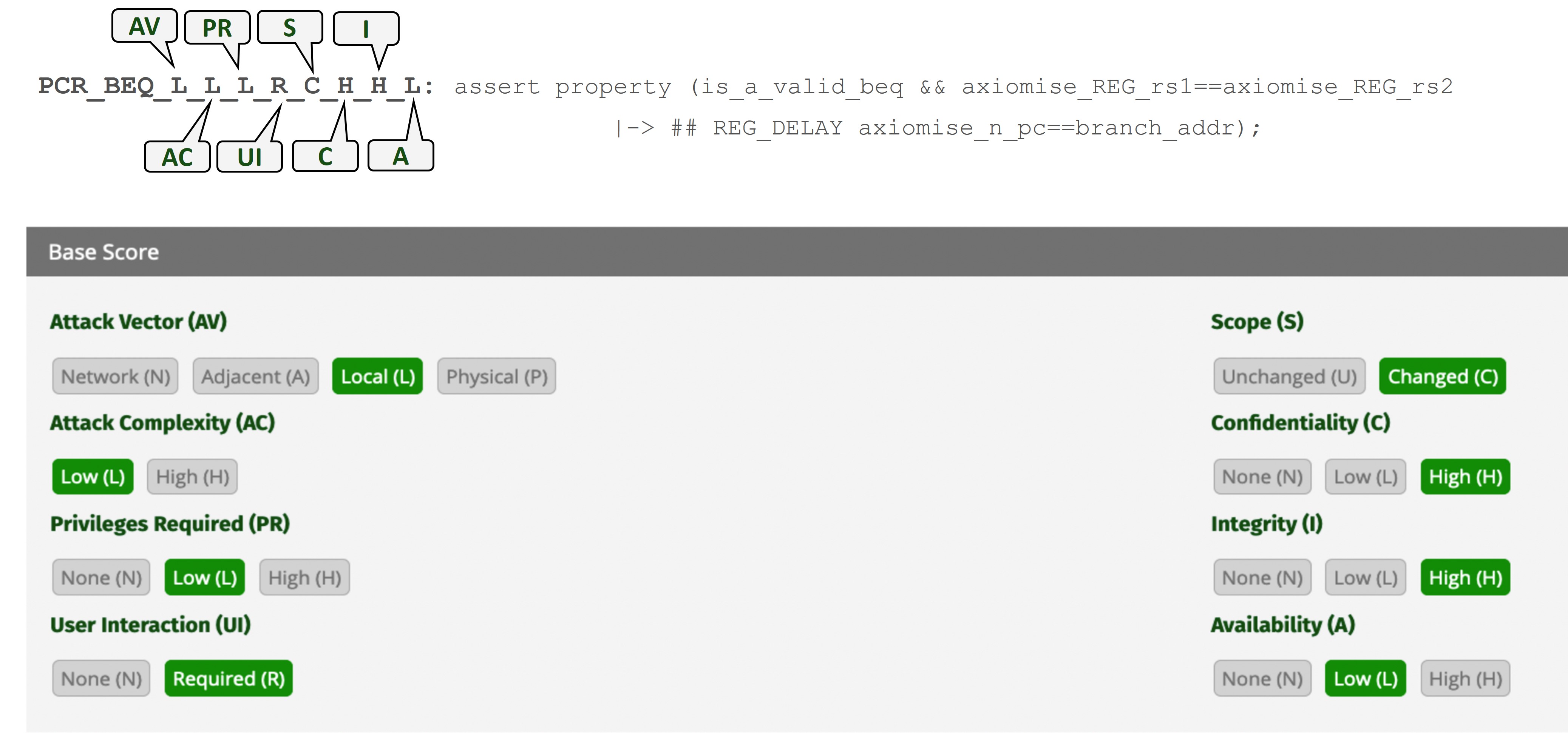 属性指定可以修改资产的合法方式,因此为资产设置的属性证明保证不会发生意外结果。图 3 显示了 Ibex RISC-V 设计和标准 BEQ(如果相等则分支)指令的属性示例。ISA指定有效的BEQ指令将比较两个寄存器,如果它们相等,则将PCR值设置为使用指令中包含的偏移量计算的新地址。已评估 CVSS 指标,并使用这些指标值的缩写字符串来命名属性。