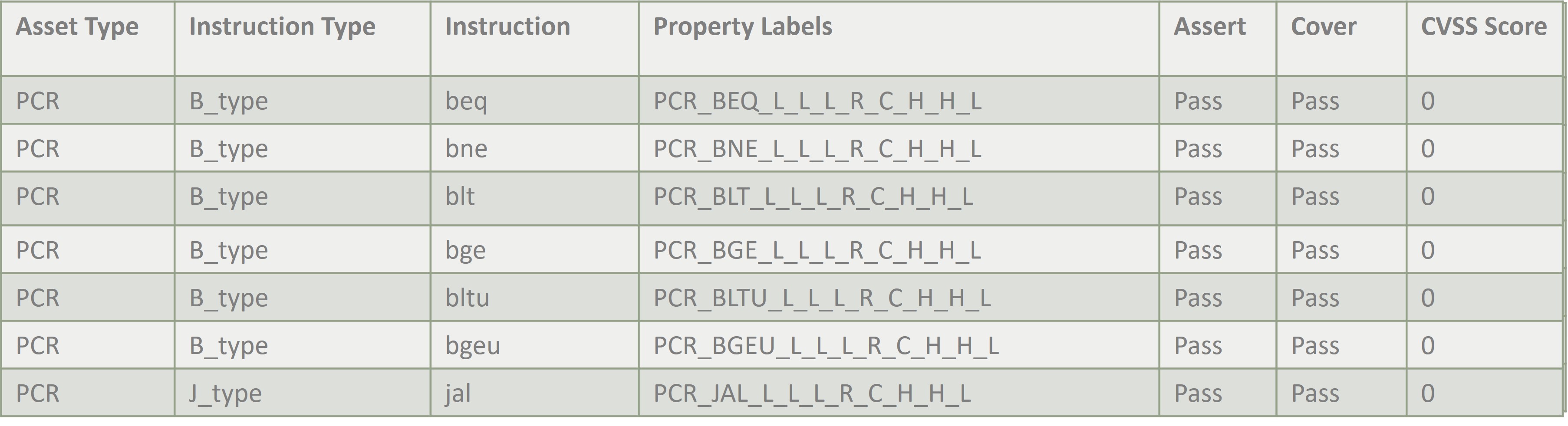 图4显示了[CV32E40P]和[零RISC-V处理器的安全验证计划片段,显示了PCR属性。此表中已包含正式结果,显示所有属性都已通过(完全证明),并且未发现与将通过处理器上运行的软件执行的处理器操作相关的漏洞。