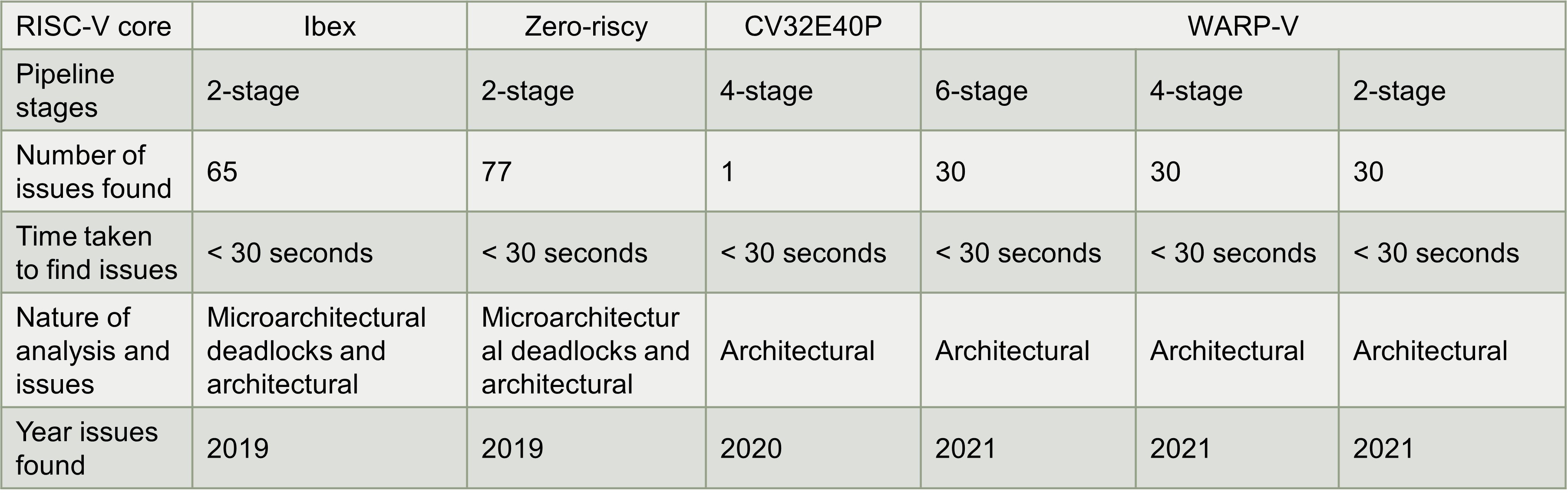 虽然形式验证提供确定性和证据的独特能力显然很有价值,但一些用户可能会怀疑所执行的详尽分析是否花费了太长时间。图8应该可以消除任何此类担忧,表明在几秒钟内在多个RISC-V处理器内核中发现了从轻微到非常危险的问题。