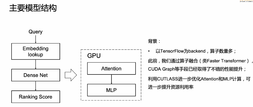 以TensorFlow为backend ,算子数量多;此前,我们通过算子融合(类Faster Transformer),CUDA Graph等手段已经取得了不错的性能提升;利用CUTLASS进一步优化Attention和MLP计算, 可进步提升资源利用率。