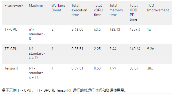 使用 NVIDIA 优化的推理库(如 TensorRT ),用户可以在数据流中的 GPU 上运行更复杂和更大的模型。 TensorRT 进一步加速同一作业,比使用 TF- GPU 运行快 3 。 6 倍,从而节省 4 。 2 倍的成本。与 TensorRT 和 TF- CPU 相比,我们的执行时间减少了 17 倍,提供的账单减少了 38 倍。