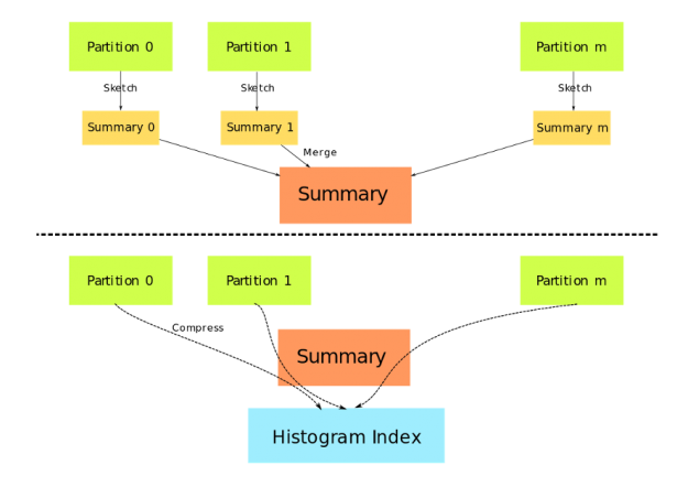 与 gpu_hist 一起使用时, DaskDeviceQuantileDMatrix 可以节省大量内存,并且输入数据已经在 GPU 上。图 1 描述了 DaskDeviceQuantileDMatrix. 的结构 数据分区不再需要复制和连接,取而代之的是,由草图算法生成的摘要被用作真实数据的代理。