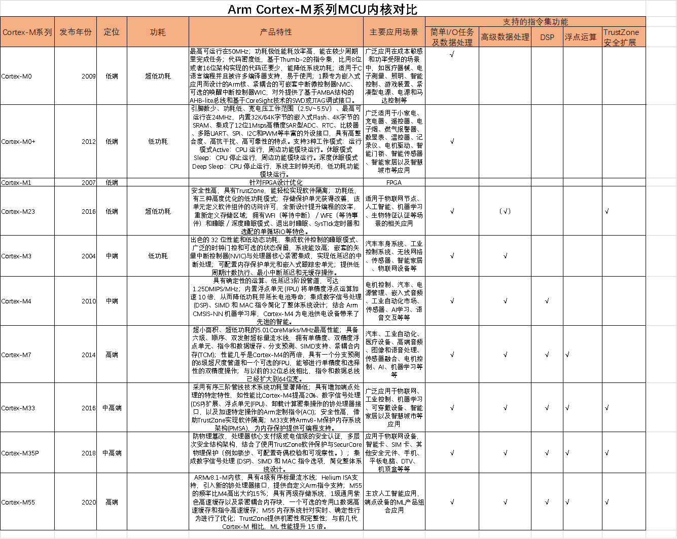 目前,不论是国内,还是国外,Arm的Cortex-M系列MCU内核都是主流。截止到目前,Arm共推出了10款Cortex-M系列MCU内核IP,这些IP可满足低、中、高端需求。其中,M0、M0+、M1、M23四个系列为低端MCU内核IP;M3和M4为中端MCU内核IP;M7、M23、M35P、M55为中高端MCU内核IP产品。