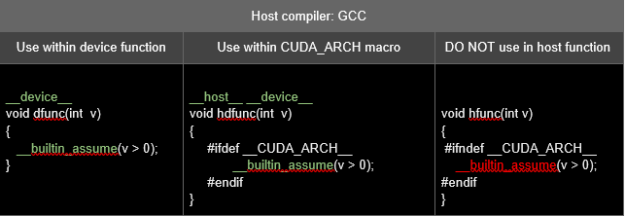 下表给出了主机编译器为 gcc 时使用 __builtin_assume 的示例。由于 gcc 不支持此内置函数,因此在未定义 __CUDA_ARCH__ 宏的主机编译阶段,对 __builtin_assume 的调用不应出现在 __device__ 函数之外。