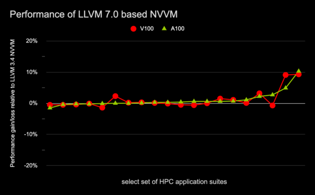 相对于 LLVM3 。 4 ,基于 A100 和 V100 的 NVVM 。