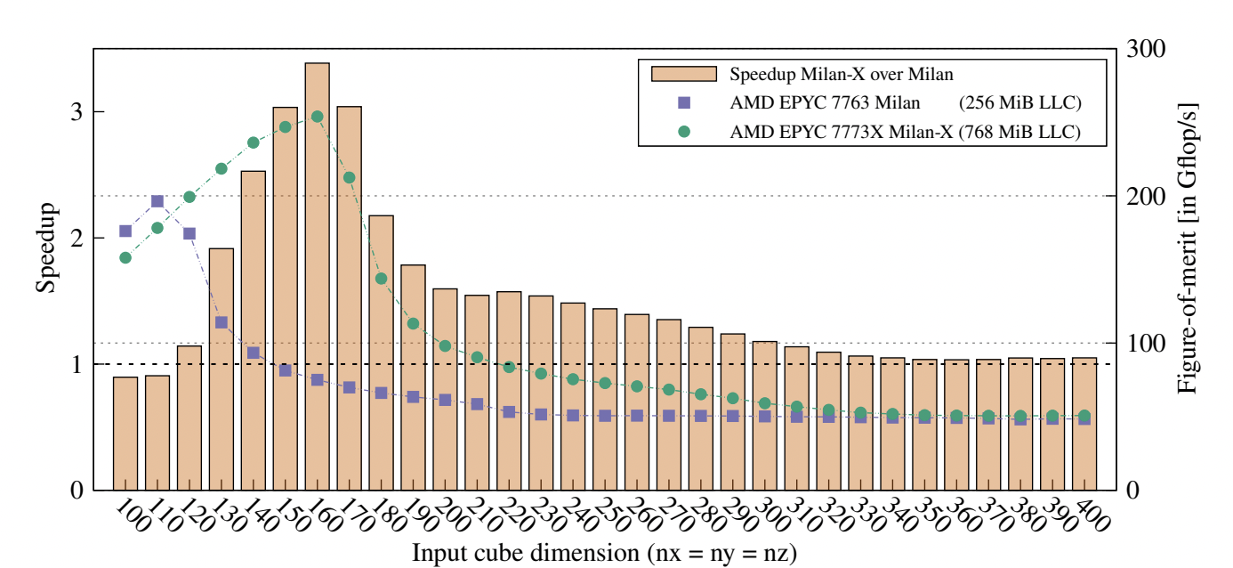 除了这类高性能消费级处理器外,HPC也开始看上了3D堆叠缓存的潜力,比如AMD的Milan-X服务器CPU。与游戏场景一样,更大的缓存可以为诸多核心HPC应用破除瓶颈。日本理化研究所(RIKEN)等一众机构和学府的研究人员拿AMD了两块AMD的服务器CPU进行比较,一边是256MB LLC的Milan,一边是768MB LLC的Milan-X。从下图可以看出,虽然随着输入变大优势逐渐变小,但输入规模较小时,大缓存占据了绝对的优势。