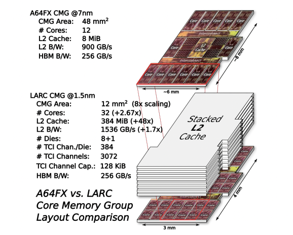 这之后,几位研究人员利用gem5模拟器,打造了两种LARC处理器模型,均以1.5nm工艺打造,且都用到了大容量的3D堆叠缓存。这一处理器的设计参照了当下超级计算机之王富岳中A64FX核心,都是基于Armv8.2架构,只不过在1.5nm这样的先进工艺下,可以看出面积优势非常大,实现了近乎八倍的面积差异,如此一来核心数也从A64FX的12+1核堆上了32核。