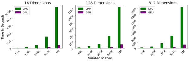 基准测试是在 DGX-1 上执行的,该 DGX-1 包含 40 核 Intel 至强 CPU 和 NVIDIA 32gb V100 GPU s 。即使对维度数进行线性缩放,对行数进行二次缩放,我们观察到 GPU 仍然保持接近交互性能,即使行数超过 1M 。