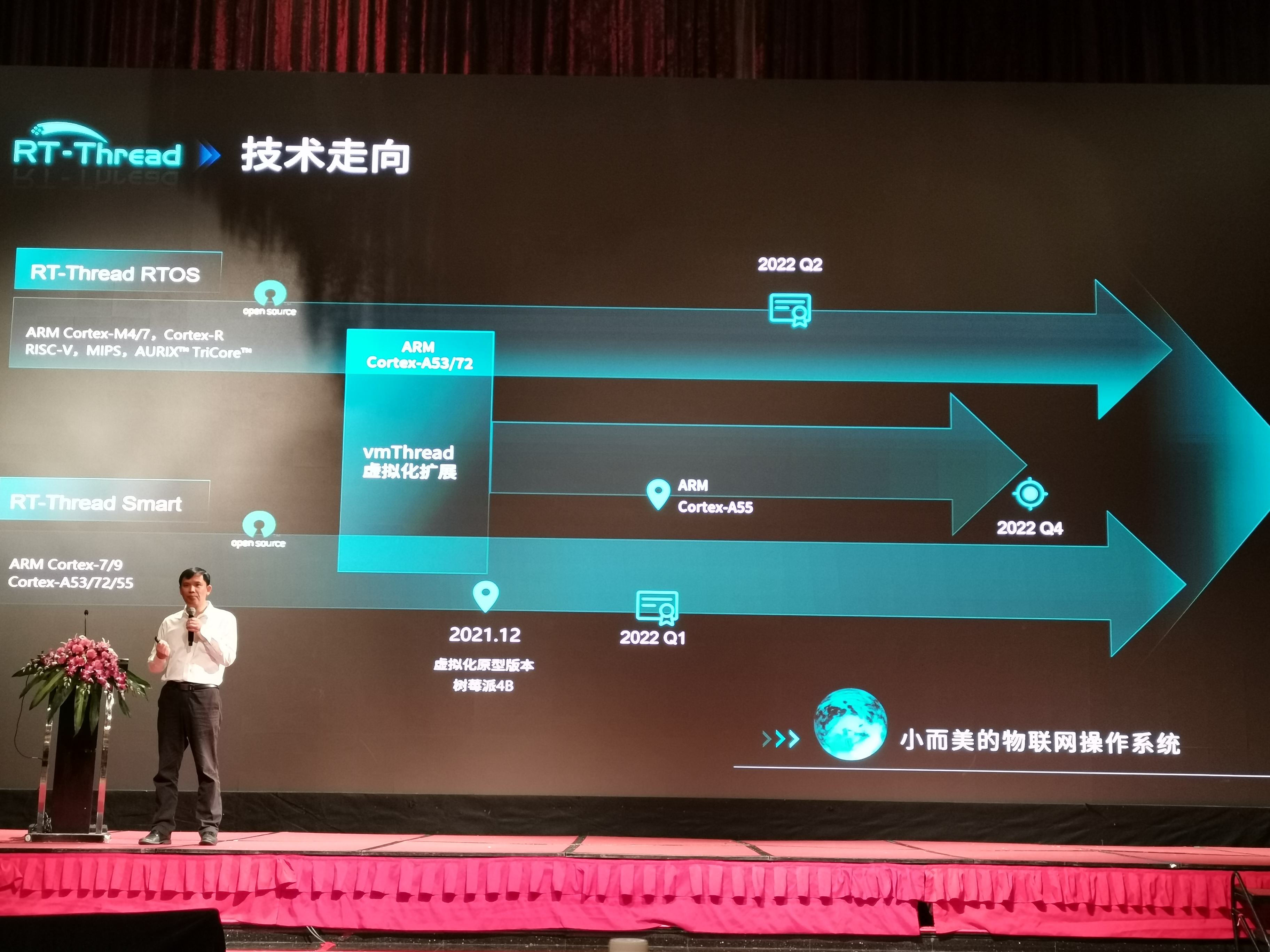 关于RT-Thread的技术走向,目前RT-Thread针对实时操作环境,有RT-Thread RTOS实时操作系统;针对复杂的armCortexA核芯片,有RT-Thread Smart;针对多核的CortexA核芯片,将会有VM-Thread虚拟化的扩展。VM-Thread只是一个扩展,它可以很好的和RT-Thread RTOS或者RT-Thread Smart结合,给上层提供一系列虚拟化的支撑。未来,将会通过虚拟化的方式做一个融合的平台,以满足更多应用场景的需求。
