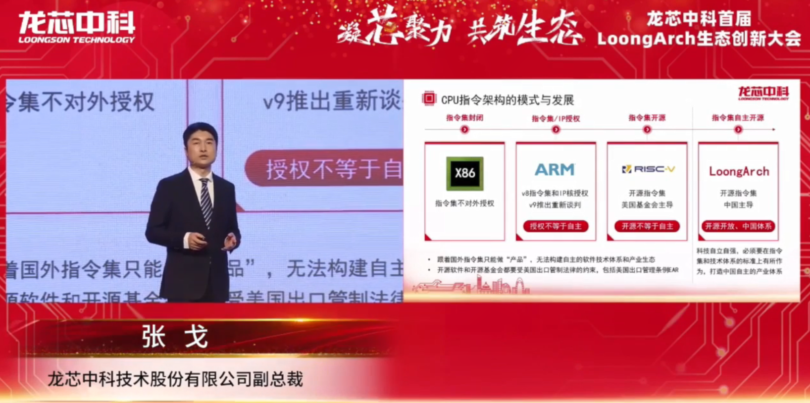 龙芯中科首届LoongArch生态创新大会上,龙芯中科技术股份有限公司副总裁张戈为我们介绍了关于CPU指令架构的模式与发展,如何打造自主创新LoongArch生态。、