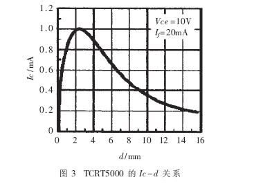 光电检测模块的功能是将指引线准确地检测出来。此处主要借助反射式光藕TCRT5000。这是一种自带发光二极管和光敏三极管的器件,其集电极电流Ic与反射距离d之间有图3所示关系。