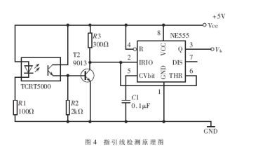 TCRT5000的应用电路见如4所示。当检测到绿色地面时,由于反射率不高,Ic1太小,三极管T2截止而输出高电平。当检测到白色地面时,由于反射率较高,Ic1较大,三极管T2饱和而输出低电平,从而实现了白线的检测。555构成了施密特触发器,用于去除反射性光耦产生的噪声和波形的整形。