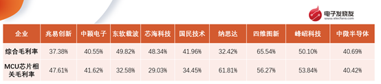 图:2020年MCU相关企业的综合毛利率及MCU芯片相关毛利率对比(数据来源:各公司财务报告)