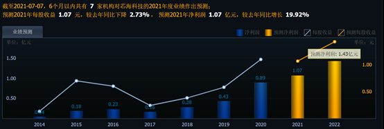 从净利润方面来看,芯海科技这几年也都是在持续增长中,从2018年的2800万元,增长到了2020年的8900万元,机构预计它今年的净利润能够突破1亿元。