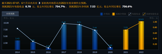 图:近7年来,纳思达的净利润情况及未来两年的预测(数据来源:同花顺)