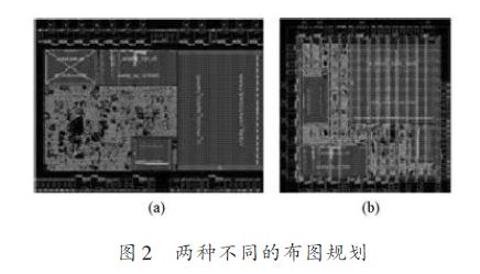 布图规划(Floorplan)要完成IO 排布、PAD 摆放、Macro(包括模拟模块、存储单元等)的定位以及芯片的形状、拥塞度(Congestion)和面积等的设定。作为一款面向用户的控制芯片,IO 的排布必须综合考虑用户的需求与设计的要求,不同功能PAD 的纵横向尺寸也不同。本文将纵横两向尺寸均较大的PAD置于芯片的南北两边,将单向尺寸较小的PAD 置于芯片的东西侧且大尺寸边朝向南北(见图2(a)),相比较于将双向尺寸均较大PAD 置芯片的四周(见图2(b)),这样的设计非常有效的减小了芯片的面积。