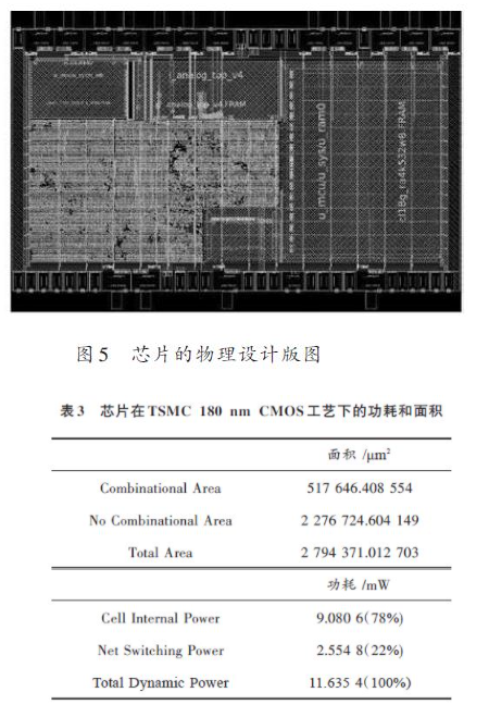 本文将布线及其优化分开来做,首先在初始布线阶段完成全局布线(global routing)、详细布线(detail rout-ing)和检查与修正(search&repair),然后采用拓扑算法对布线进行优化,同时对电流漏功耗进行优化。为了防止天线效应的发生,在芯片完成阶段对芯片进行了天线效应修复设计,此时芯片中依然存在空白区域,需要填充filer 以满足DRC 的要求。图5 是该芯片的物理设计版图,表3 是该芯片的面积与功耗,可见总面积为2 794 371.012 703 μm2,总功耗为11.635 4 mW.经过仿真后证明芯片于50 MHz时钟频率下正常工作,满足设计要求,证明本次设计是正确有效的。