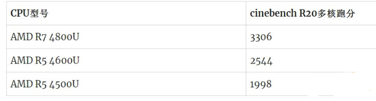 通过下表可以看出在CPU跑分性能方面,AMD R7 4800U比R5 4600U提升近30%。之前我们在AMD R5 4600U对比R5 4500U的文章已经知道,他们差距大概27%,也差不多30%。