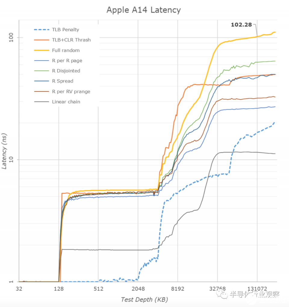 这里有趣的是苹果处理内存事务的深度。我们测量了大约148-154个未完成的负载和大约106个未完成的存储,这应该是内存子系统的负载队列和存储队列的等价数字。毫不奇怪,这也比市场上的任何其他微体系结构都要深入。相比之下,AMD的Zen3和英特尔的Sunny Cove分别为128/72和128/ 64。英特尔在这里的设计与苹果相差不远,实际上这些最新的微架构的吞吐量是相对匹配的——如果苹果将这种设计部署到非移动内存子系统和DRAM上,那将是很有趣的。