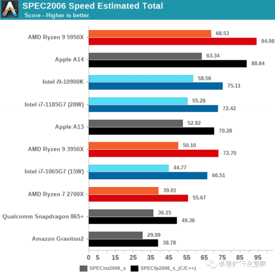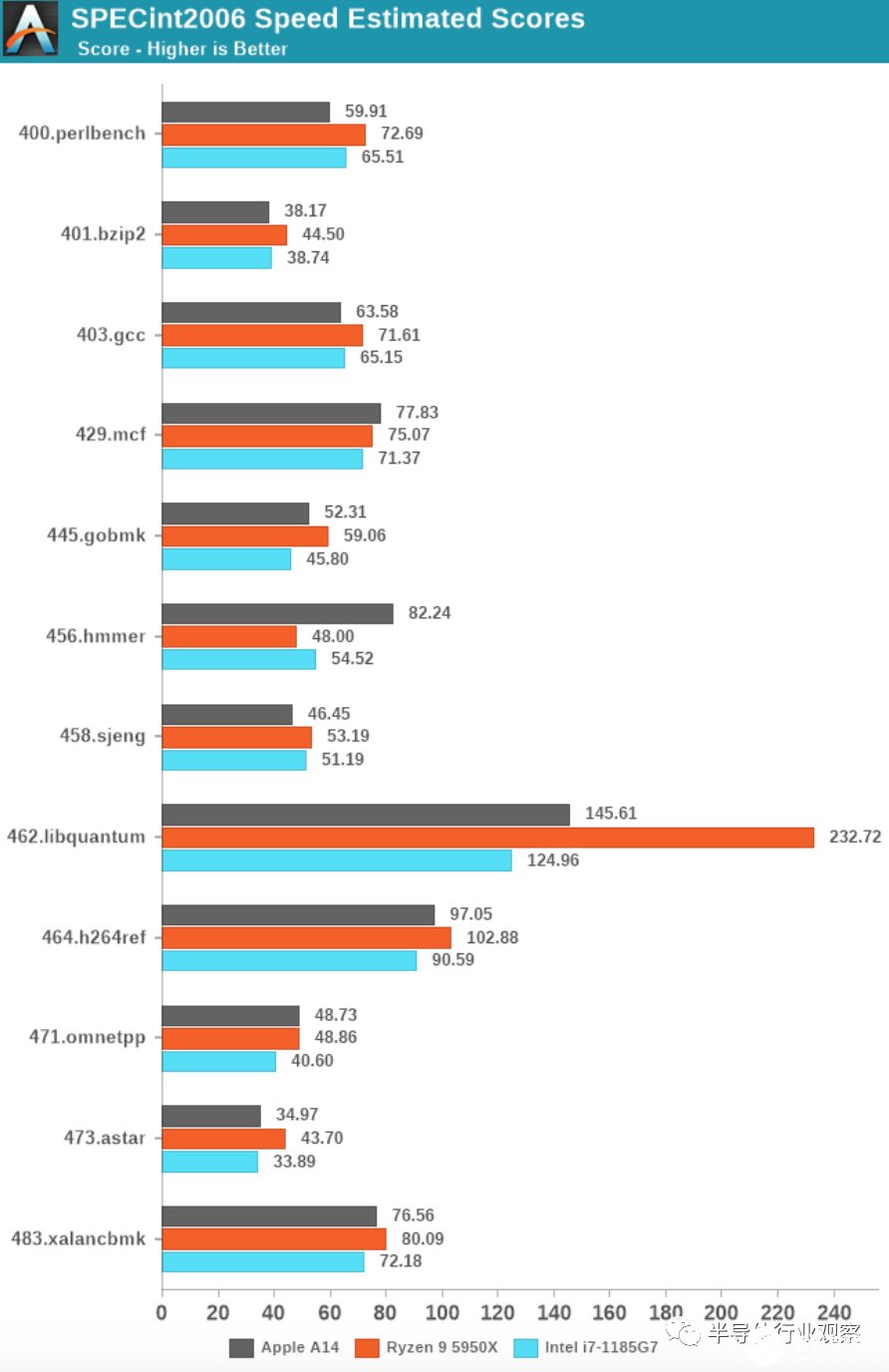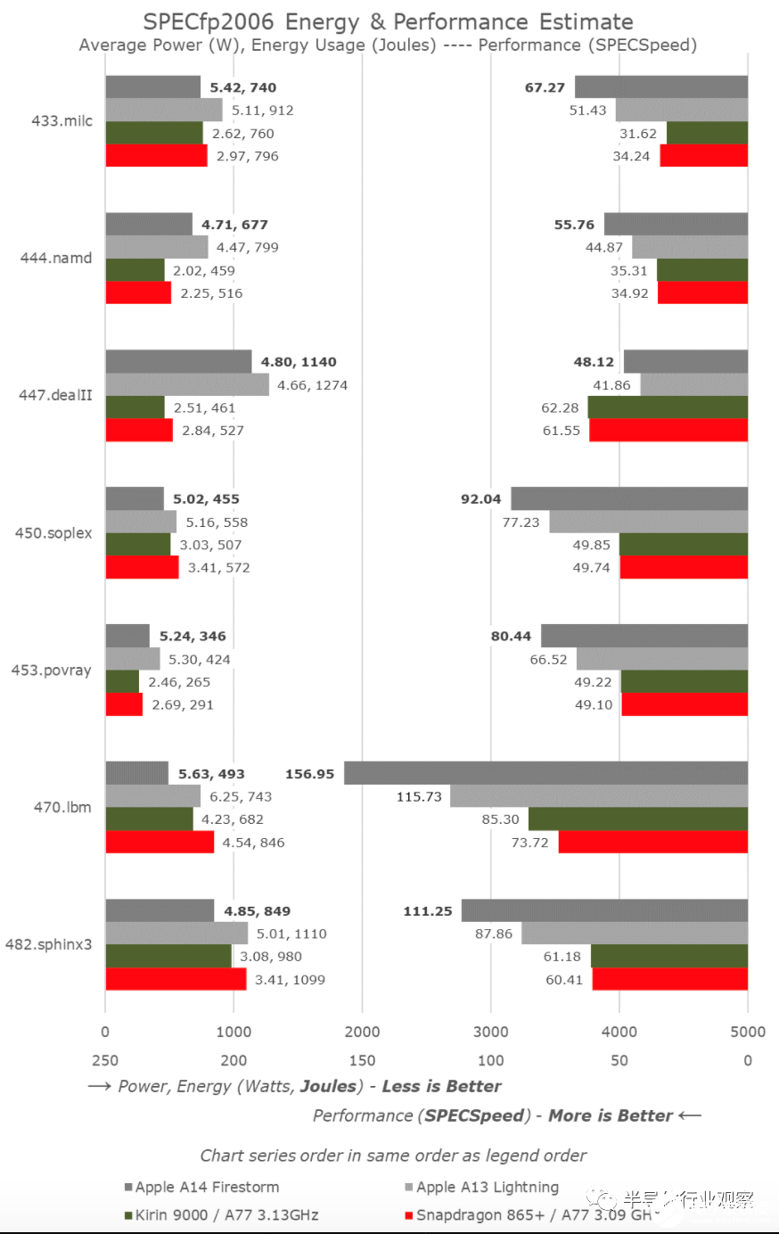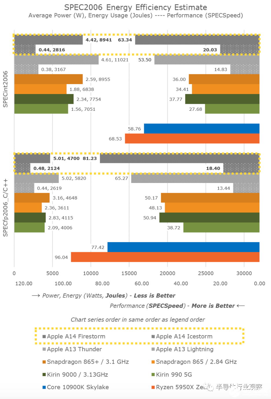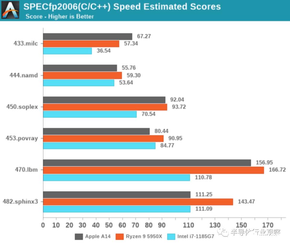 在整个SPEC2006图表中,A14的表现绝对出色,在绝对性能上领先于AMD最近的Ryzen 5000系列。