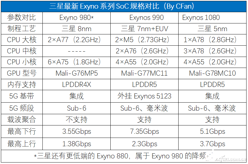 需要注意的是,早前网上曝光的Exynos 1080安兔兔跑分图显示其主频高达3.0GHz,但正式版的最高主频却被限定到了2.8GHz,可能是出于能耗比方面的考虑。