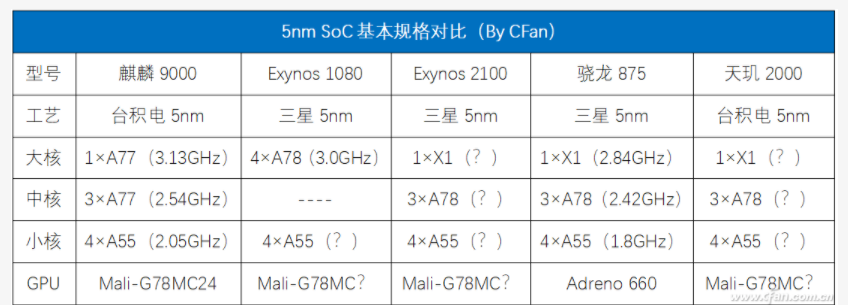 首先,咱们先来简单对比一下这几颗5nm SoC的基本规格。麒麟9000和天玑2000都采用台积电旗下的5nm EUV工艺制造,而Exynos系列和骁龙875则由三星5nm EUV代工。