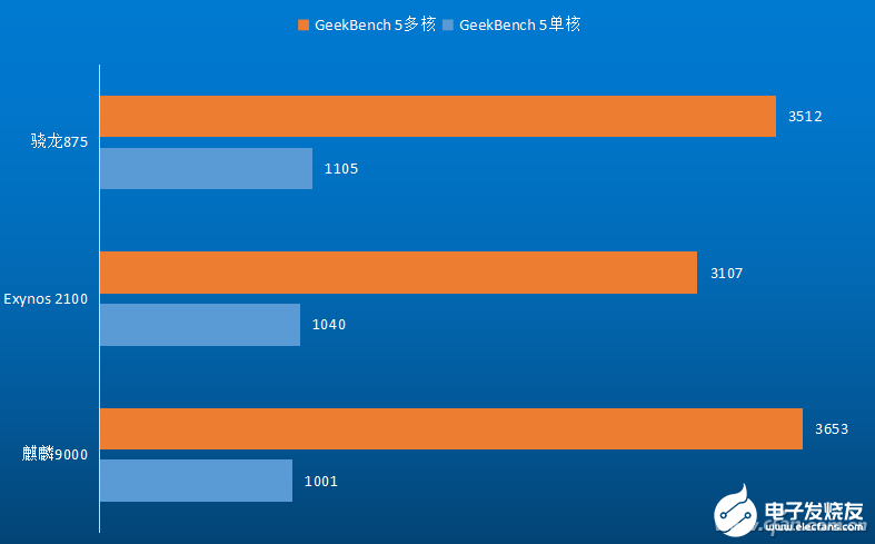 其中,麒麟9000的单核/多核成绩分别为1001和3653,Exynos 2100的单核/多核成绩分别为1040和3107,骁龙875的单核/多核成绩分别为1105和3512。