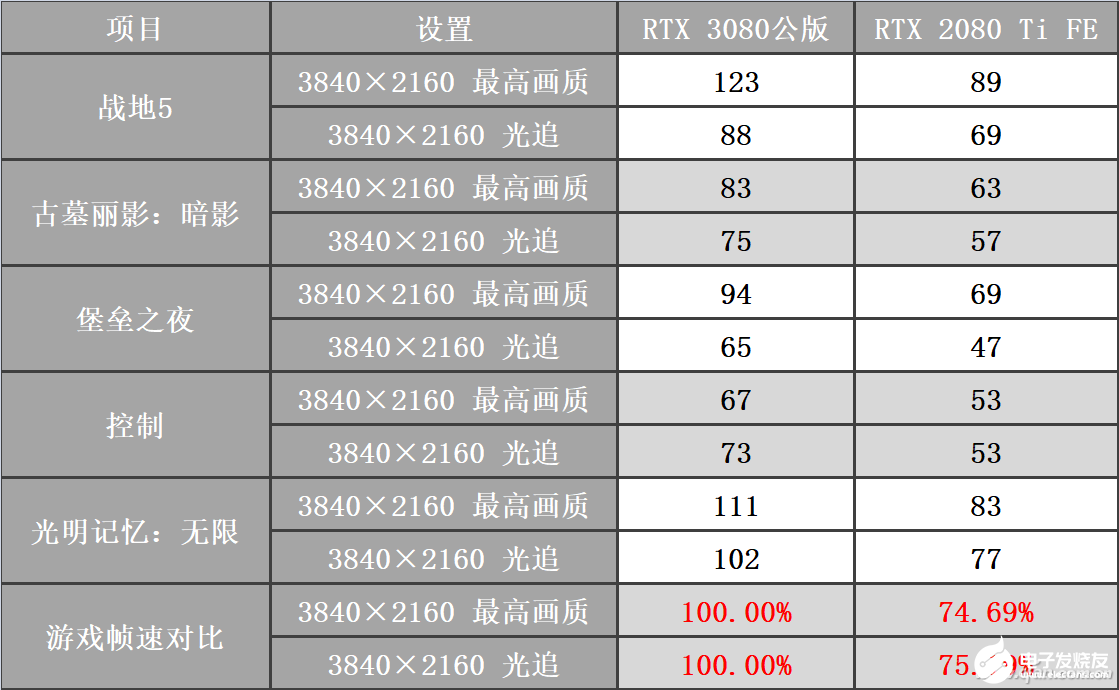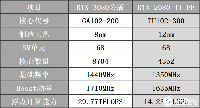 不过对于不同代甚至不同架构的GPU,这种对比就不合适了,比如RTX 3080拥有两倍于RTX 2080 Ti的浮点运算次数,帧速能达到RTX 2080 Ti的两倍吗?从之前的测试大家就知道,当然不是这样。