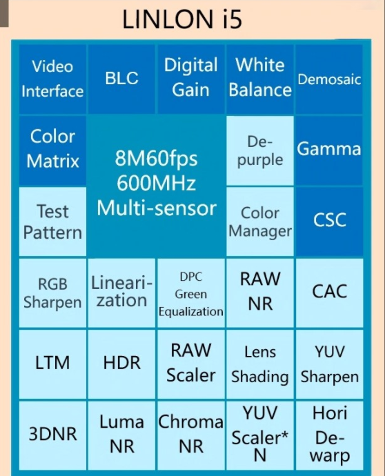 “玲珑”i5 ISP处理器支持非常宽动态的实施,包括支持DOL2/3、stagger2/3处理、以及传统和数字化HDR处理技术。在降噪领域,i5 ISP也实施了各种降噪手段,包括亮度降噪、色度降噪和时域降噪,特别是通过3DNR,多帧图像融合的方法,可以实现很好的降噪效果。