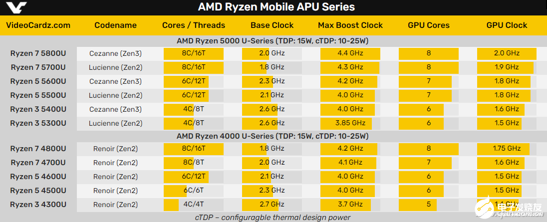 Cezanne平台的移动锐龙5000U同样包含3个成员,它们的共性是型号数字第二位为双数,即锐龙7 5800U、锐龙5 5600U和锐龙5 5400U,和马甲版的兄弟们相比主频略有提升。