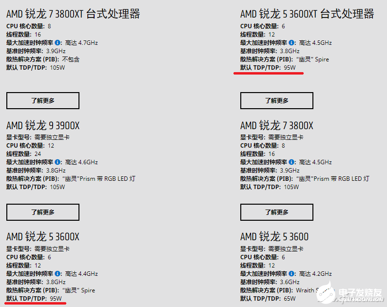 这里有一点要注意的是,在大于100W和比较让人放心的65W之间,大家已经习惯了95W TDP型号目前出奇地少,只剩下了九代酷睿的可超频版本以及锐龙3600 X/XT,未来可能是被放弃的一个档位。从这点来看,近期购买风扇的话,对应95W的产品真的有点鸡肋,最好不要考虑了。