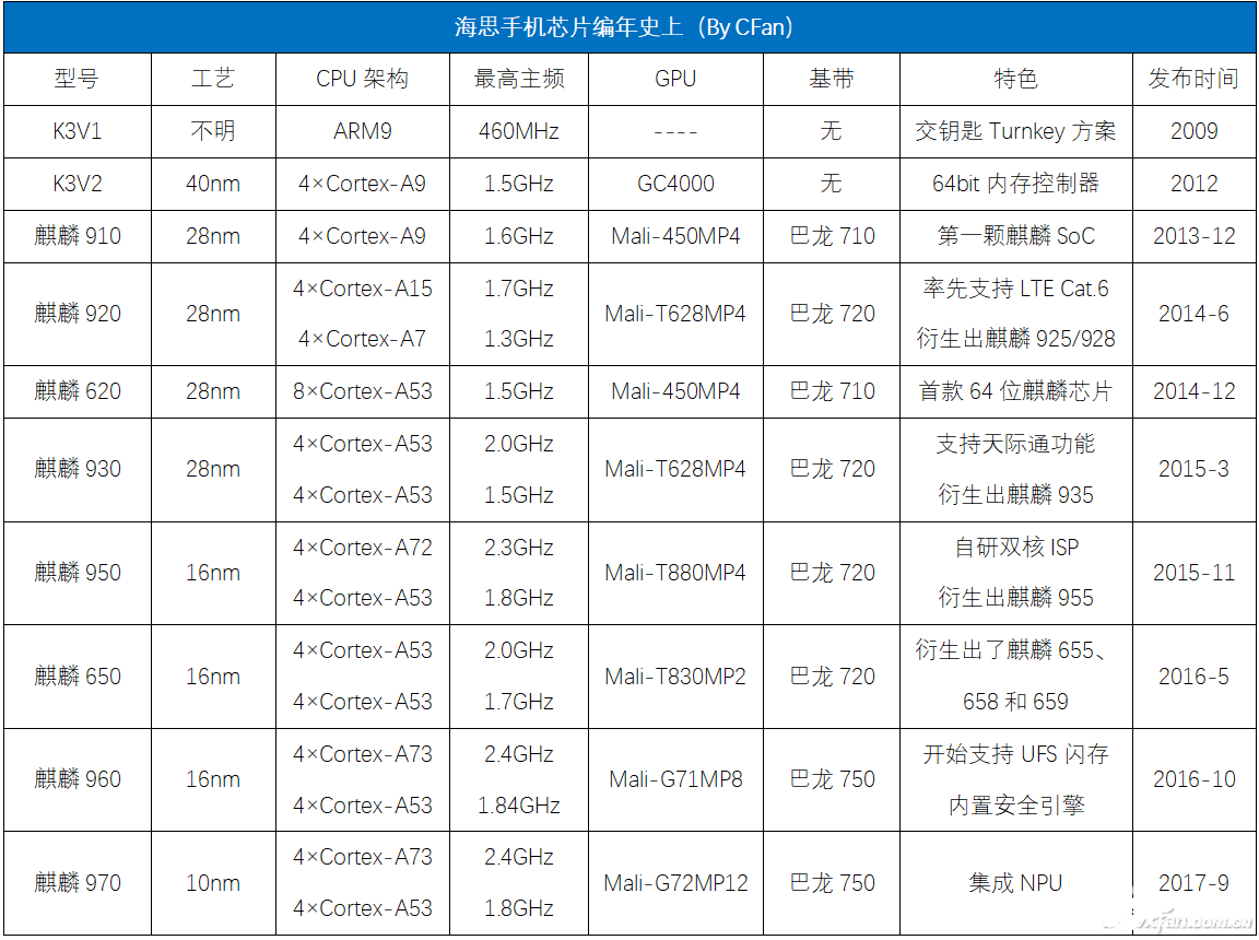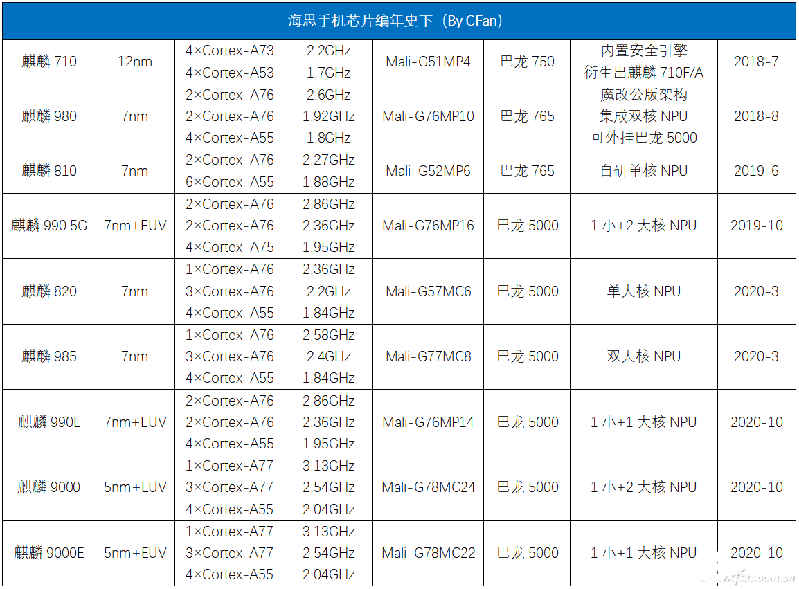 CFan简单整理了华为海思历代移动处理器的规格对比表,个人感觉其中最具历史意义的就是麒麟970和麒麟810。前者因首次引入独立的NPU单元,开创了SoC端侧人工智能的先河,为AI智慧拍照(包括场景识别、超级夜景等)奠定了硬件上的基础。而后者则凭借先进的工艺和架构,性能可以领先高通、三星和联发科的同级芯片,成为了中端手机领域的“神U”。