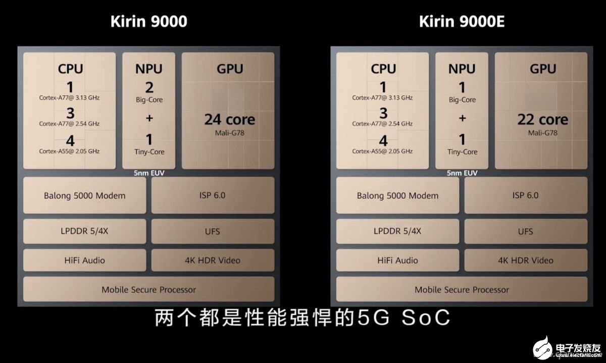 麒麟9000和麒麟9000E分别集成了3核(2大+1小)与2核(1大+1小)的NPU矩阵。在其他方面,两颗芯片的规格就完全一致的了,包括巴龙5000基带、四核心ISP、支持支持LPDDR5/4X内存和UFS3.1闪存,支持HiFi音质和4K HDR视频,集成安全芯片,是全球首个通过国际CC EAL5+的移动终端芯片。