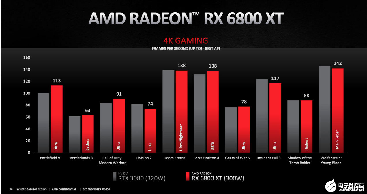 然后来看看Radeon RX 6800 XT,该显卡启用了72组计算单元,共计4608个流处理器,主频2015MHz、高配2250MHz,128MB Infinity缓存,16GB GDDR6显存,整卡功耗降至300W,适合游玩4K分辨率下的游戏。从官方数据来看,RX 6800 XT相比RTX 3080,在2K、4K分辨率下游戏帧率相差无几,整体性能出色。