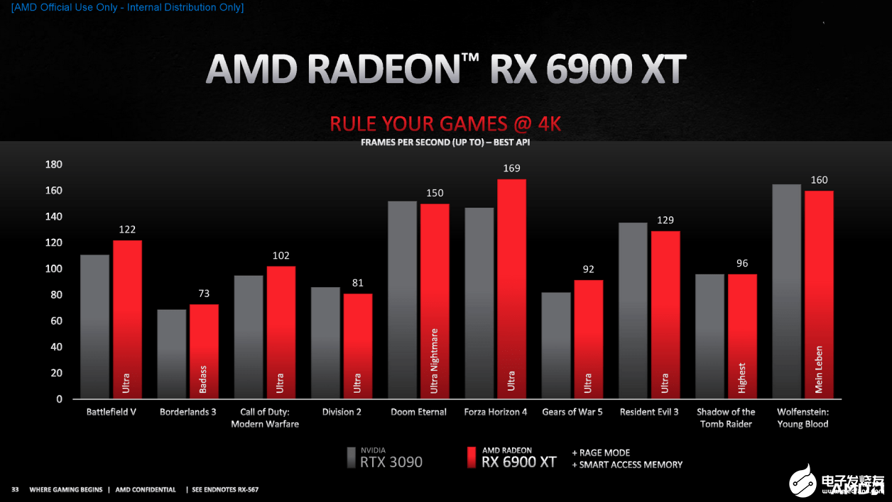 最后介绍的,自然是重头戏Radeon RX 6900 XT。这款产品拥有80组计算单元、共计5120个流处理器,主频2015MHz、高配2250MHz,128MB Infinity缓存,16GB GDDR6显存,整卡功耗300W,适合游玩8K分辨率下的游戏。从官方数据来看,RX 6900 XT的能耗比相当突出,能效提升幅度达到65%,游戏性能更是接近RTX 3090,算是一款很有竞争力的产品。