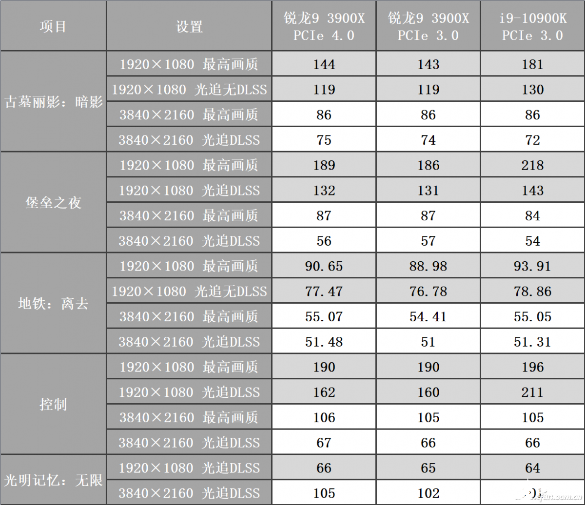 在3DMark测试中,尽管PCIe 3.0(X570主板为BIOS中强制设置)和PCIe 4.0的实测带宽确实差别很大,但游戏引擎的跑分差距很小。而且其中AMD平台的成绩还明显更好一些,这和之前说的有点不一样嘛,难道支持PCIe 4.0的平台即使跑PCIe 3.0也更强吗?我们再看看实际游戏测试吧。