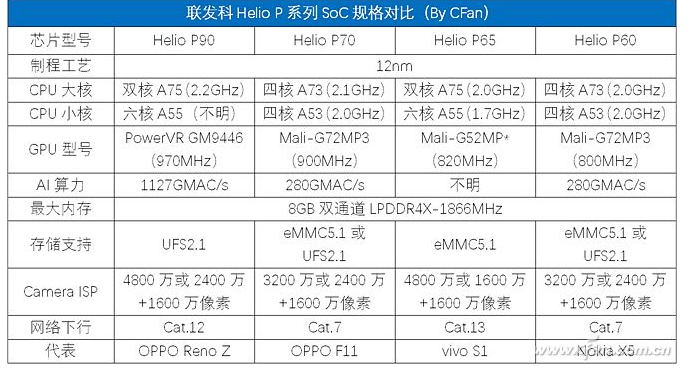 作为后起之秀,Helio P65的诞生直接就宣布了前辈Helio P70的死刑,因为它采用了和Helio P90相同的CPU架构——双核Cortex-A75+六核Cortex-A55,只是最高主频略有降低而已。
