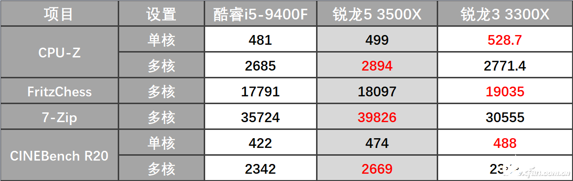 从配置来看,酷睿i5和锐龙5 3500X的核心、线程、最高频率都很接近,但缓存却相差巨大,这当然有弥补Zen 2独立I/O芯片延迟的原因,但一些办公、设计等需要大缓存的应用中肯定也是很有用的。而锐龙3 3300X虽然定位最低,却有最高的频率和最多的线程数量。至于价格,i5-9400F的波动区间恰好在两款AMD处理器中间。
