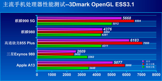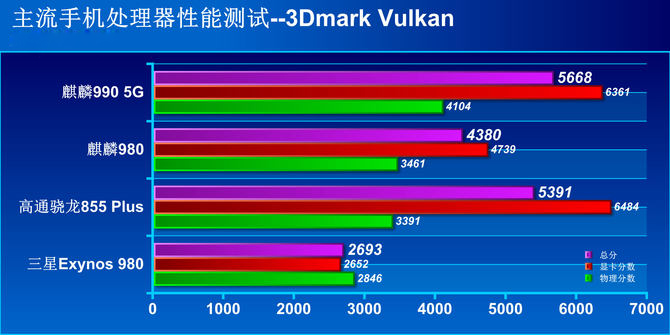 3D性能方面,可以看到OpenGL ESS3.1部分,麒麟990 5G和高通骁龙855 Plus总分都非常接近,但在Vulkan部分麒麟990 5G则领先高通骁龙855 Plus。麒麟990 5G使用的是公版架构的Mali G76 GPU,而高通骁龙855 Plus使用Adreno 640 GPU,在性能上Adreno 640要优于公版架构的Mali G76,但麒麟990 5G的Mali G76拥有16个核心并且频率高达700MHz,也让麒麟990 5G的3D性能在OpenGL部分和骁龙855 Plus不相上下,而在新的Vulkan API下麒麟990 5G的3D性能获得了更好的发挥,特别是在物理加速部分。