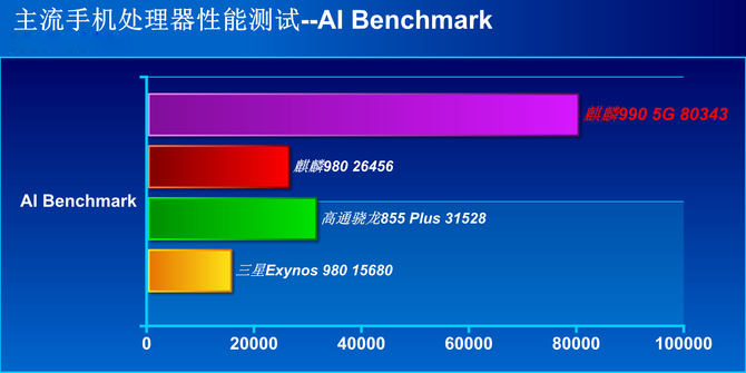 麒麟990 5G采用华为自研达芬奇计算架构,采用达芬奇3D架构,让NPU的算力提升,可以看到AI Benchmark分数有绝对的优势,麒麟990 5G在AI Bnechmark中得分80343风,瑶瑶领先高通骁龙855 Plus,相对上一代的麒麟980,同样有了数倍的成绩提升。另外对比三星的Exynos 980,麒麟990 5G的AI性能领先4倍有多。