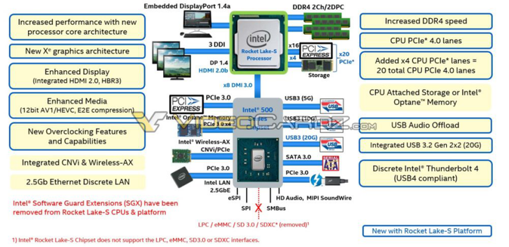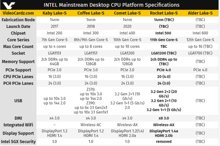 按照此前英特尔的路线图,Comet Lake的下一代产品应该是Rocket Lake,近日,外媒VideoCardz曝光了一张疑似是Rocket Lake-S系列的功能概述,展示了Rocket Lake系列的一些主要功能。