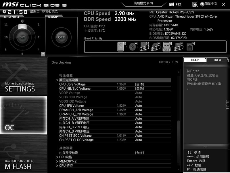 微星Creator TRX40主板采用了Click BIOS 5图形化UEFI 。BIOS主界面包含CPU、内存的频率和电压, CPU以及主板温度等信息。