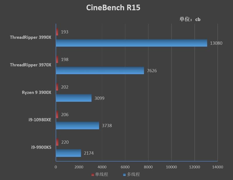 ThreadRipper 3990X单线程分数为193cb,多线程成绩则为13080cb。