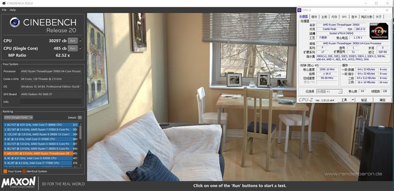ThreadRipper 3990X单线程分数为485cb,多线程成绩则为30297cb。