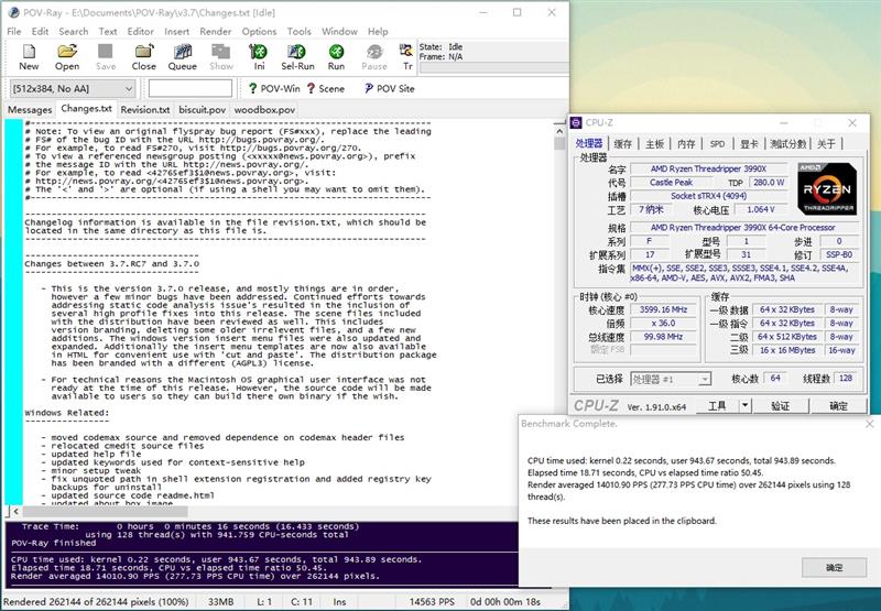 很遗憾我们采用各种手段都没有让POV-Ray跑满128个线程。ThreadRipper 3990X的多线程成绩为14010PPS,单线程则为460PPS。