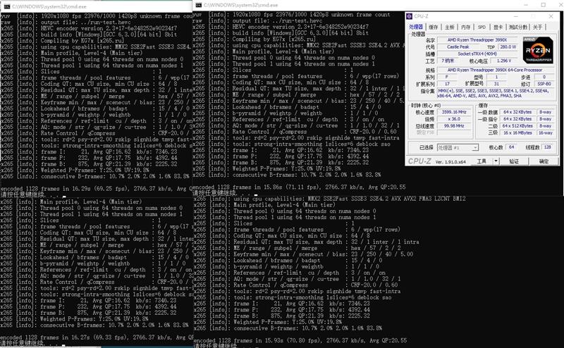X264 FHD Benchmark最多只能支持到16个线程,不过可以多开。本来应该要开8个才能用完全部的128个线程,有点太麻烦了,我们只开了4个,最终只用到了64个线程,算是发挥了3990X一半的实力。