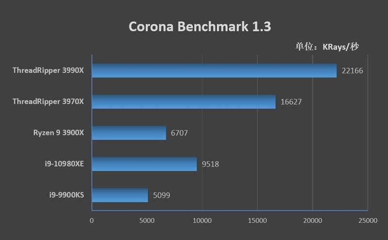 在Corona Benchmark 1.3测试中,ThreadRipper 3990X可以达到i9-9900KS四倍以上的性能,比i9-10980XE则快了133%。
