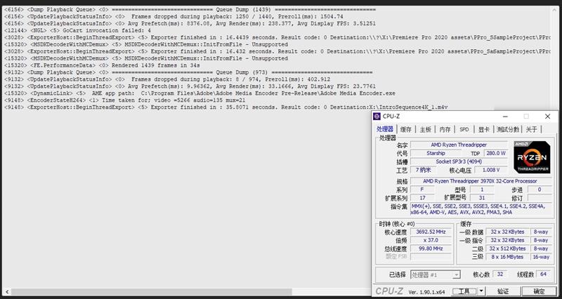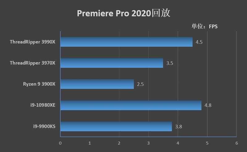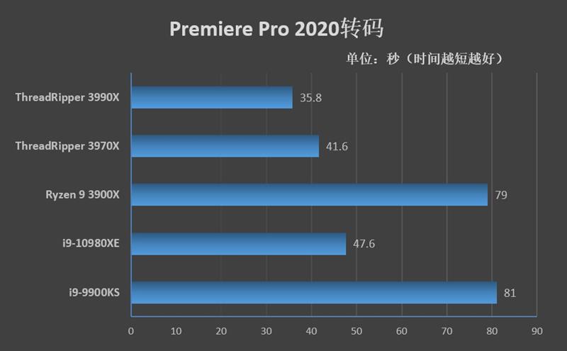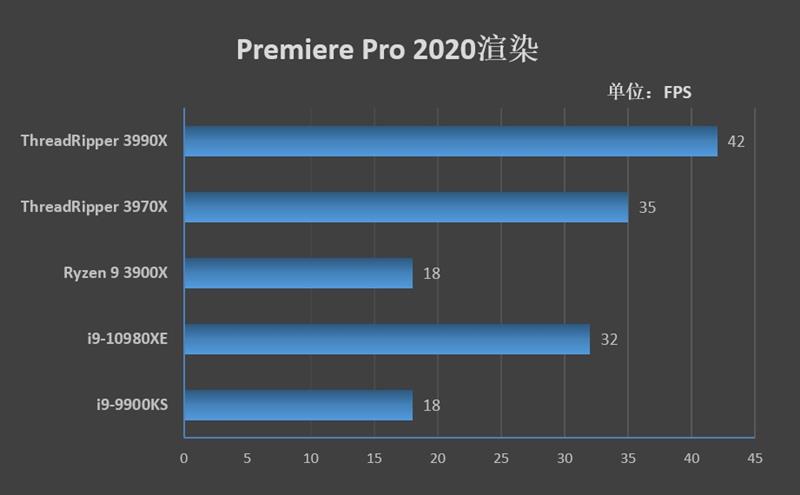 在进行视频渲染时,Premiere Pro2020可以利用ThreadRipper 3990X约40%的核心数,即便如此,也能傲视群雄了。ThreadRipper 3990X在进行视频渲染时帧率比i9-10980XE高了30%左右,比ThreadRipper 3970X也要强不少。
